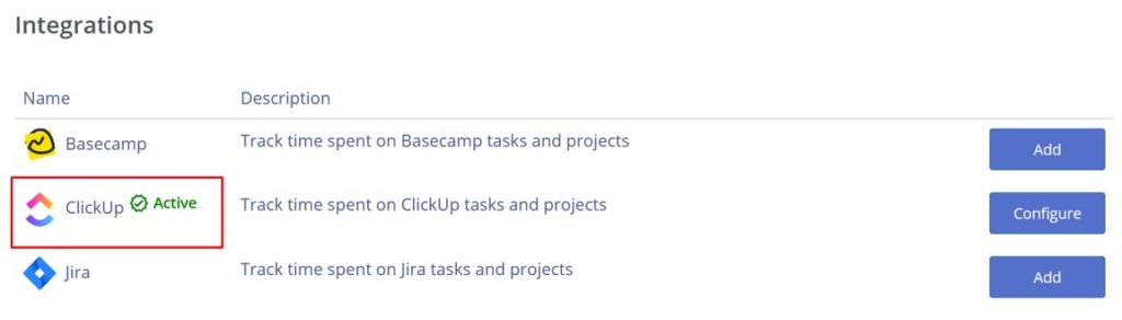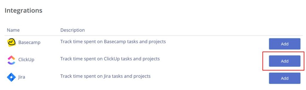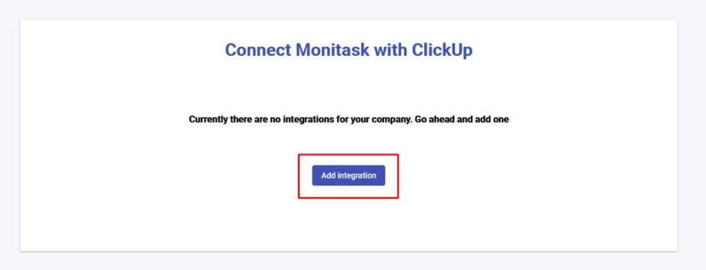 1) Browse the integrations page in Monitask admin dashboard: https://app.monitask.com/integrations and click “Add ClickUp integration”