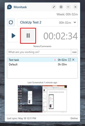 When user starts time tracking in the Monitask desktop application, we sync time to ClickUp after the first minute and then every 10 minutes. Also, time is synced each time user stops tracking (Clicks on the Pause button)