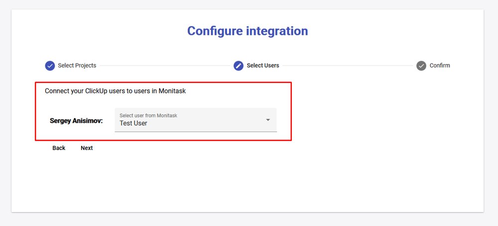 7) Map ClickUp users to users in Monitask and click Next