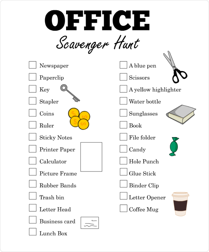 - Create a list of items or challenges for teams to find or complete (e.g., “Take a photo with a team member wearing red shoes” or “Find a stapler that’s not in the supply closet”).
