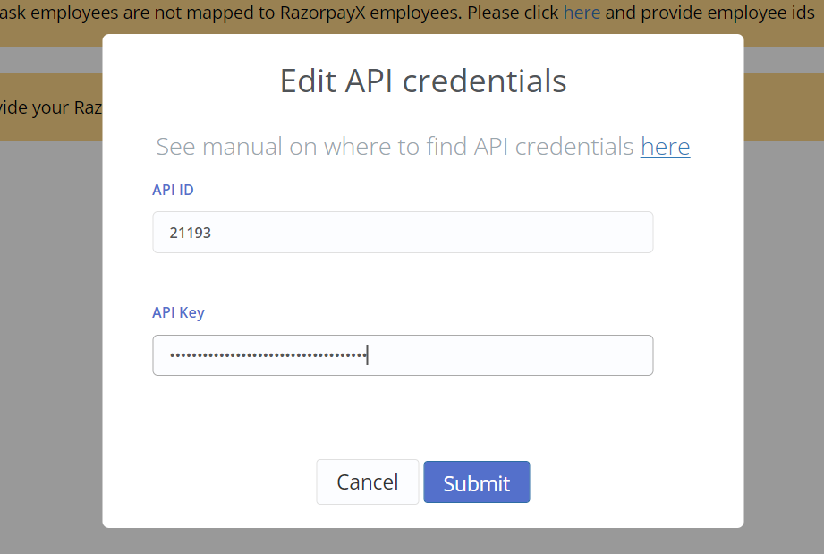 3) Open Settings on RazorpayX account and find your API ID and API Key and fill the form in Monitask