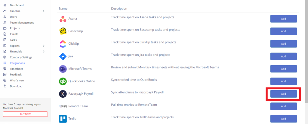 1) Browse the integration page in Monitask admin dashboard: https://app.monitask.com/integrations and click add RazorpayX integration