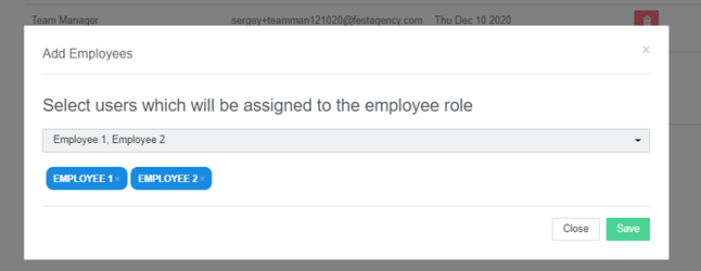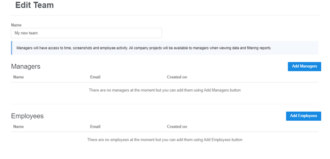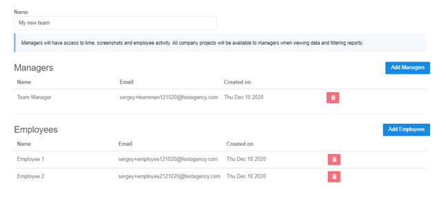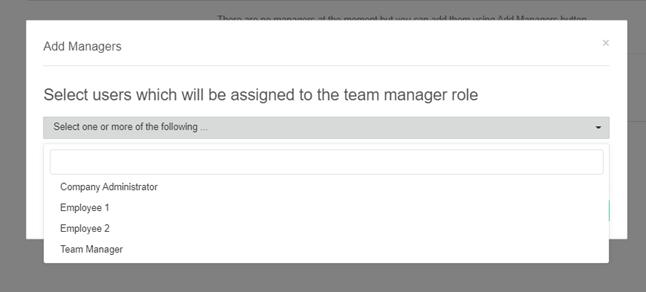 Managers can view screenshots and time information of assigned employees. To add a manager click on the “Add managers” button and you will see the following pop-up: