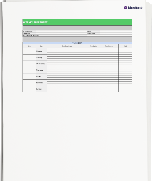 Monitask provides a blank weekly timesheet in Word format. This is an easy-to-use and editable document. You can quickly enter the number of hours worked each day, as well as any overtime pay rates you need to track. The format is perfect for printing on standard 8.5×11 paper for records that need to be kept physically.
