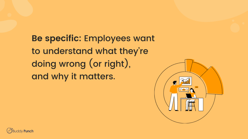 Constructive feedback should also be specific and it should focus on what the employee can do to improve. For example, “I noticed that you didn’t take a break during your shift. In the future, I would like you to take a five-minute break every hour.”