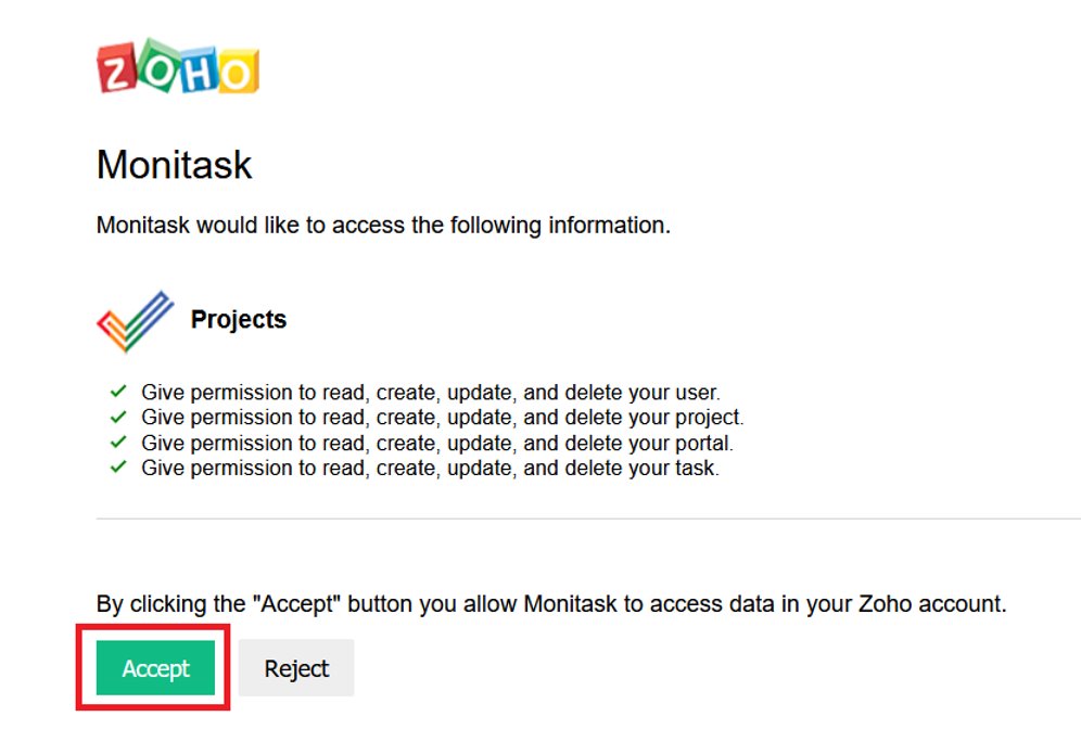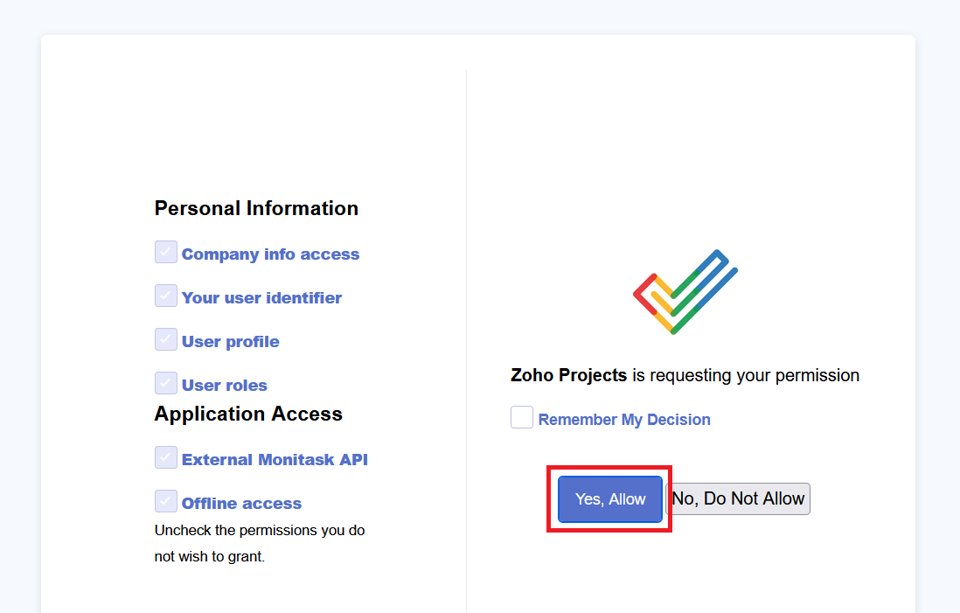5) Authorize Monitask access to your Zoho data