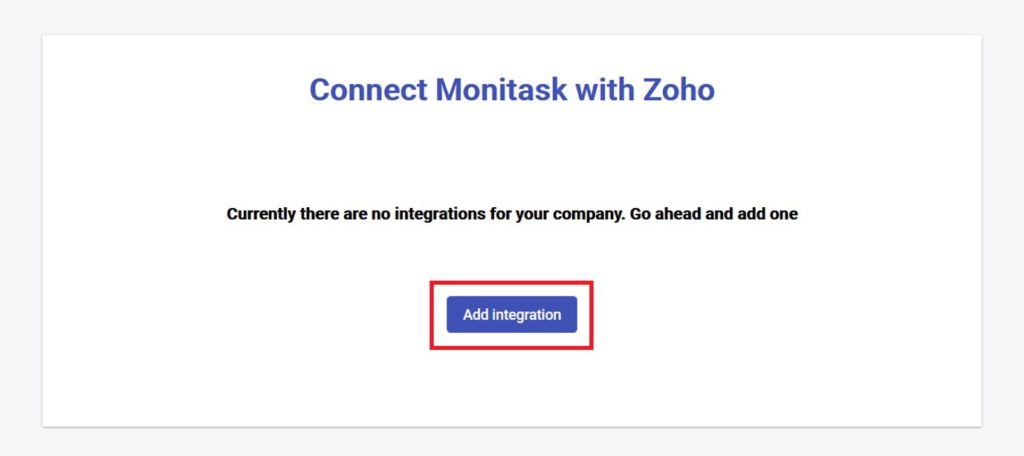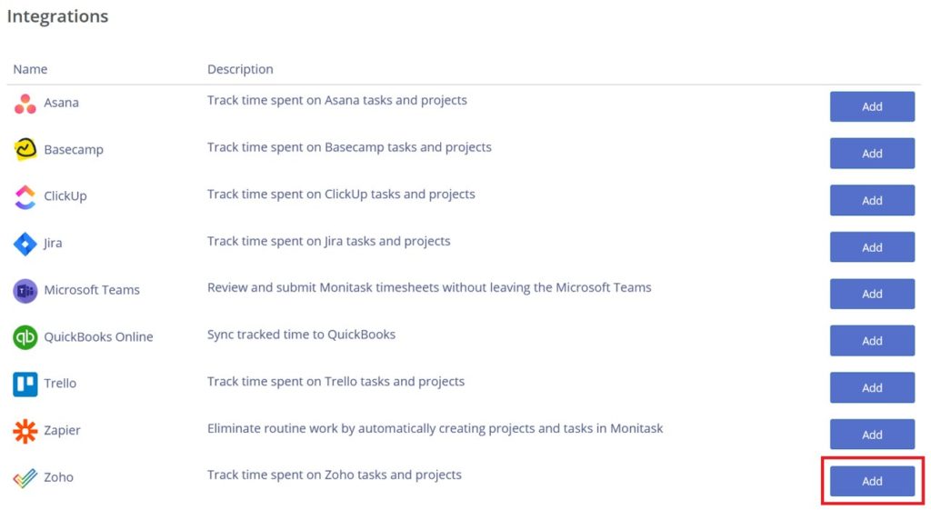 1) Browse the integrations page in Monitask admin dashboard: https://app.monitask.com/integrations and click Add Zoho integration